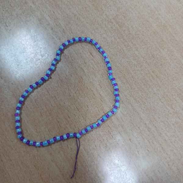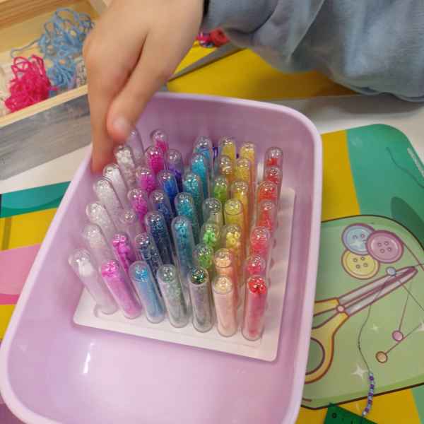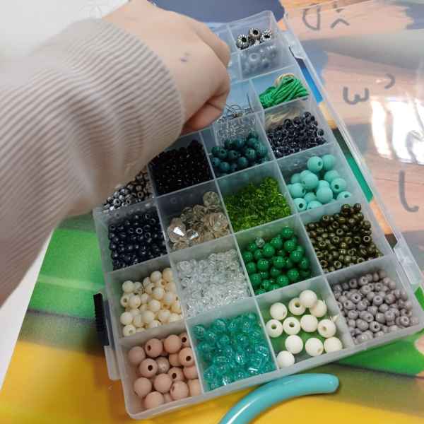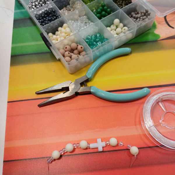 Samodzielne wykonywanie bransoletek z kolorowych koralikówi sznurków okazuje się być nie lada wyzwaniem dla uczniów klasy 5c podczas zajęć rozwijających pod opieką nauczyciela Bożeny Reszke .