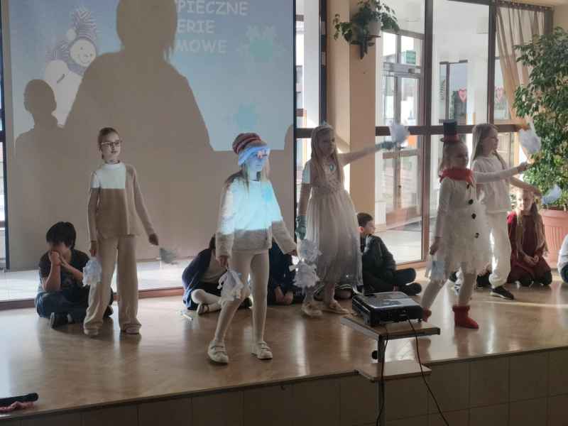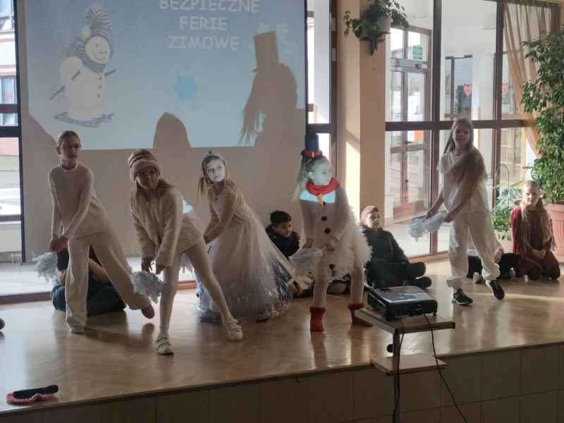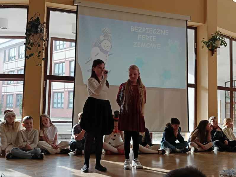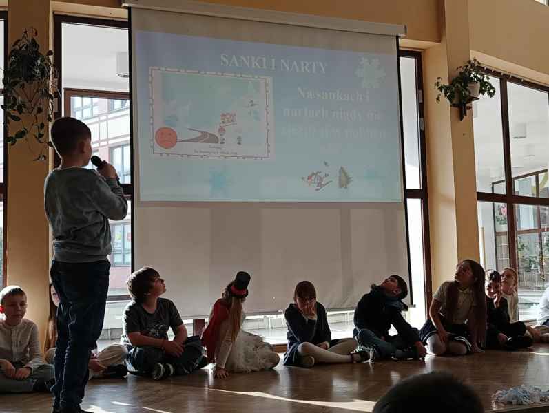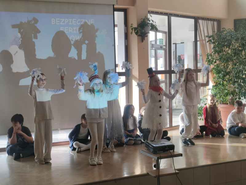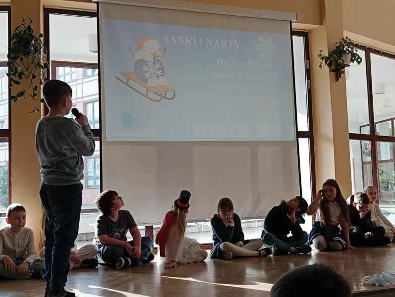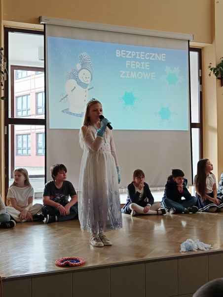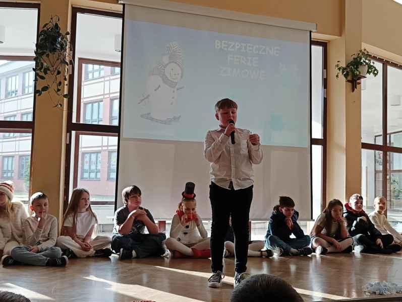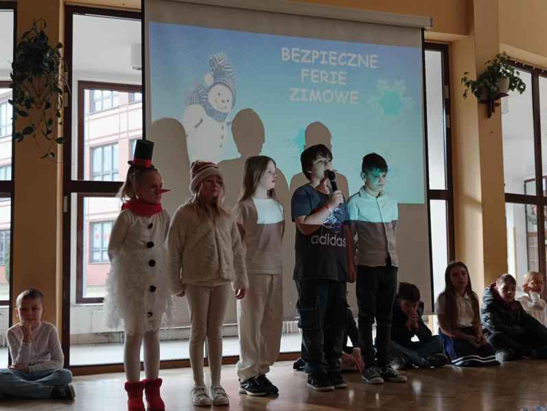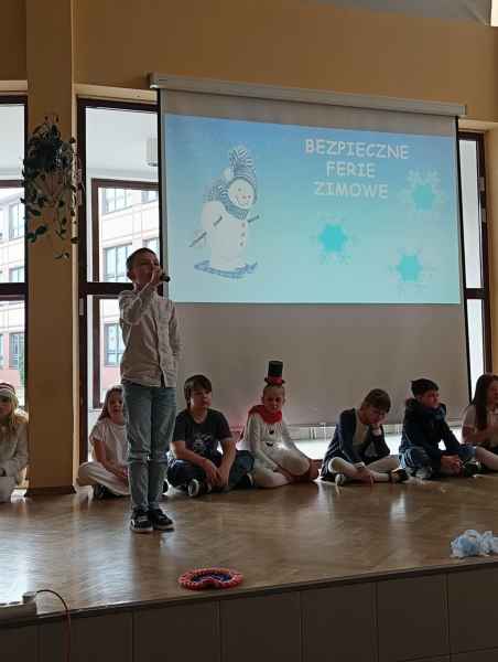 Przed samymi feriami uczniowie klasy 3B zaprosili wszystkie dzieci klas młodszych oraz oddziałów przedszkolnych do obejrzenia apelu "Bezpieczne ferie zimowe". Podczas przedstawienia mali aktorzy przypomnieli najważniejsze zasady, o których należy pamiętać, aby nasze zabawy zimowe były zawsze bezpieczne.