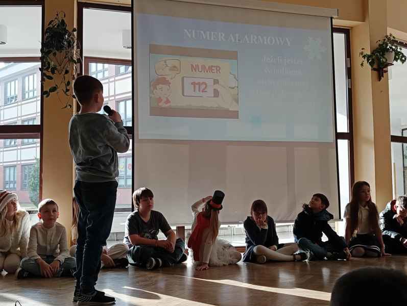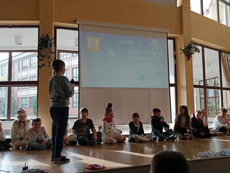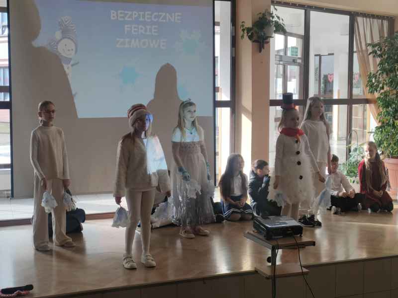 Zwrócili także uwagę na zasady dotyczące bezpiecznego poruszania się pieszych po drogach oraz właściwego zachowania, gdy jesteśmy świadkami jakiejś niebezpiecznej sytuacji. Występy uczniów klasy 3B wzbogaciła dodatkowo praezentacja multimedialna przedstawiająca i utrwalająca wszystkie omawiane podczas apelu zagadnienia związane z bezpieczeństwem podczas zimowych ferii.