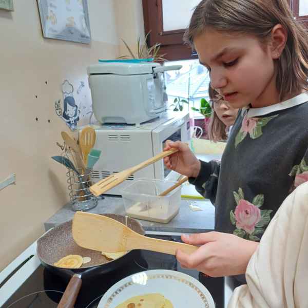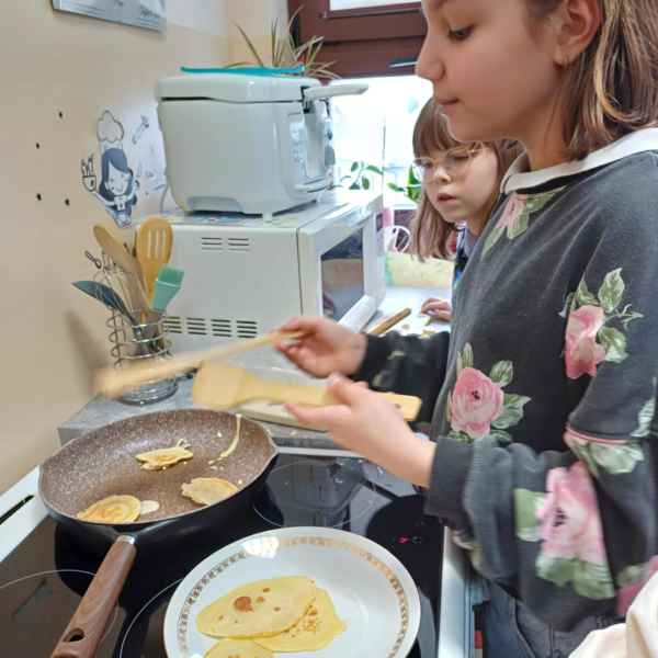 Grupa dziewcząt przygotowała pankejki z owocami. Grupa miały za zadanie nie tylko zrobić ciasto na puszyste naleśniki, ale również odpowiednio je udekorować. Pankejki były podawane z różnymi owocami – od truskawek i jagód po banany i maliny – oraz posypane odrobiną cukru pudru. Zajęcia pozwoliły uczniom nauczyć się, jak przygotować ten klasyczny przysmak w zdrowej wersji.