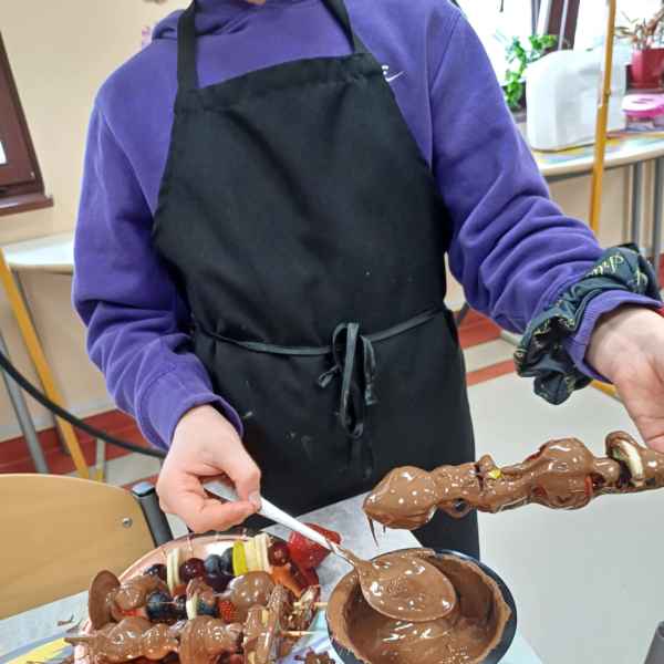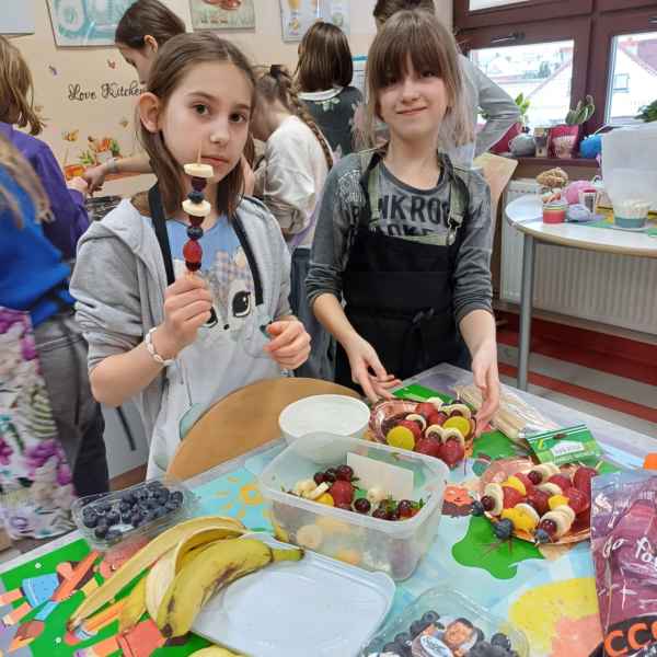 Jednym z zadań było przygotowanie owocowych szaszłyków w polewie czekoladowej. Uczniowie wykazali się dużą kreatywnością przy dobieraniu owoców, łącząc różnorodne smaki i kolory. Na patyczki nakładały się kawałki soczystych truskawek, bananów, winogron oraz jabłek, a na końcu każdy szaszłyk zanurzany był w rozpuszczonej czekoladzie. Owocowe połączenie z czekoladową polewą to idealna opcja na zdrową, a zarazem pyszną przekąskę.