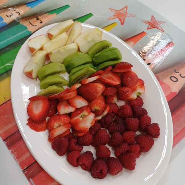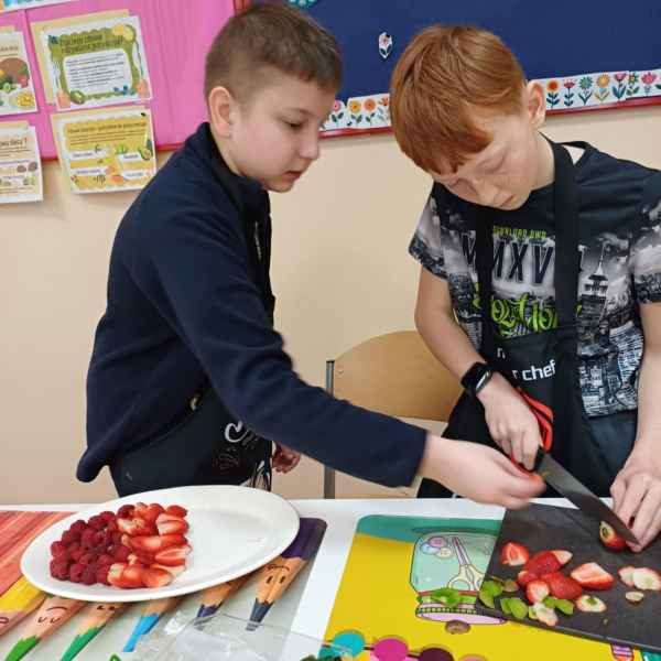 Kolejnym wyzwaniem dla uczniów była sałatka owocowa, która stała się prawdziwym dziełem sztuki. W grupach uczniowie obierali i kroili owoce, dbając o precyzyjne cięcie i odpowiednią kompozycję smakową. W skład sałatki wchodziły najróżniejsze owoce – od jabłek po kiwi, maliny czy borówki. Całość dopełniały jogurt naturalny lub miód, które były używane jako dressing do sałatki. Uczniowie chwalili się swoimi dziełami, a efekt końcowy okazał się równie smaczny, co estetyczny.