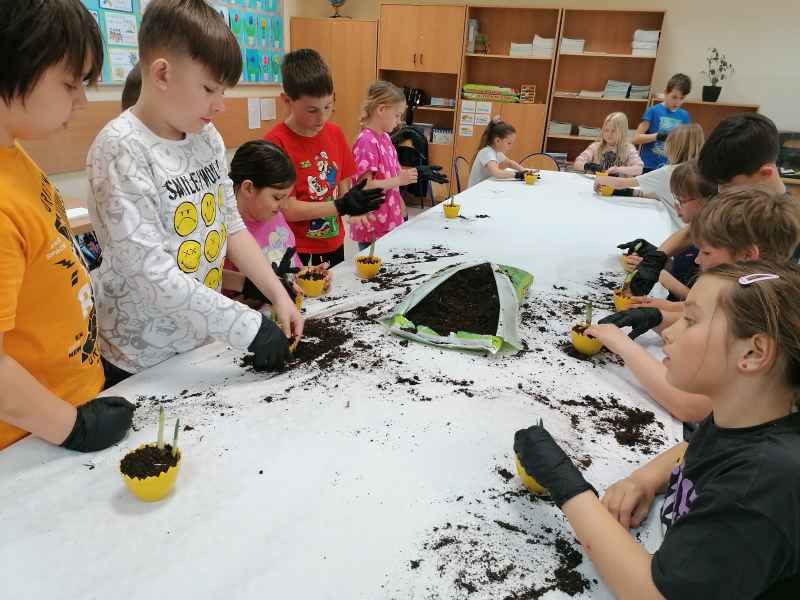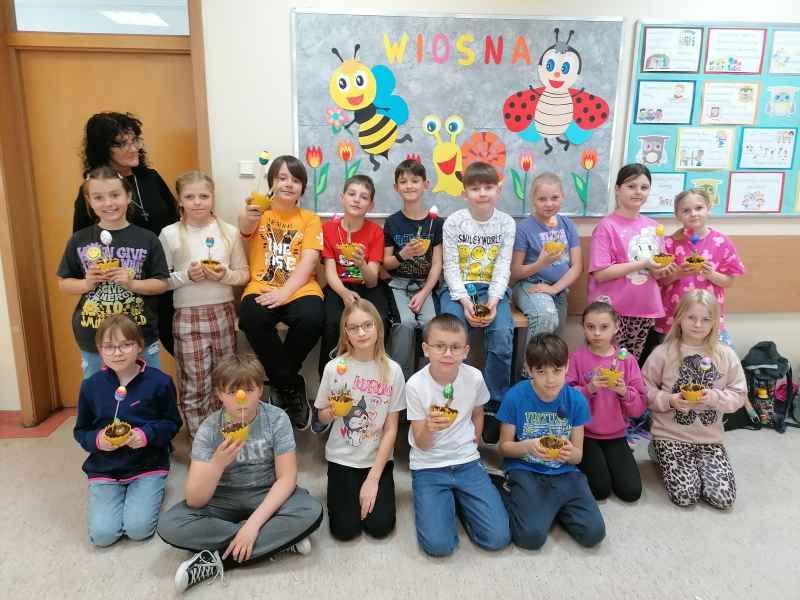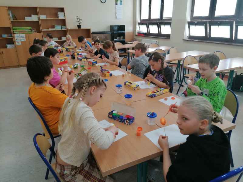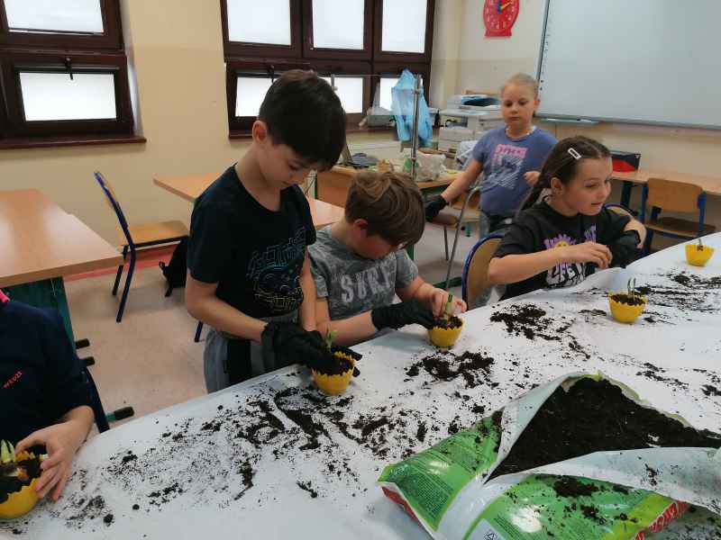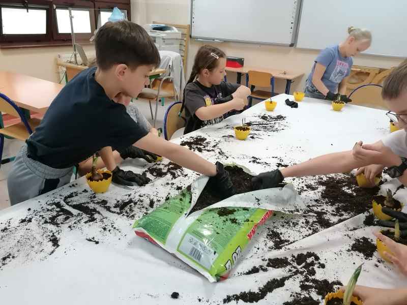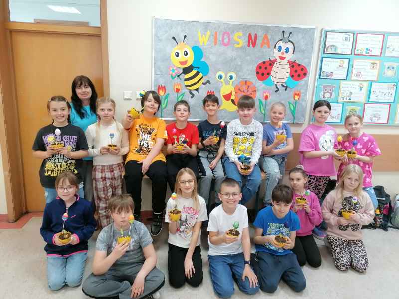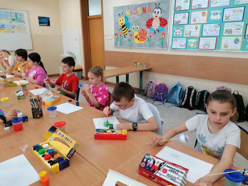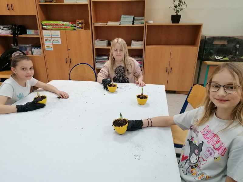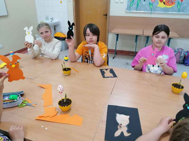 Dnia 10 kwietnia 2025 roku uczniowie klasy 3B uczestniczyli w świątecznych warsztatach, których fundatorem była Rada Rodziców. Dzieci przygotowywały dekoracje związane ze zbliżającymi się świętami. Pierwszym zadaniem do wykonania było pomalowanie farbami plakatowymi jajka styropianowego, aby stworzyć piękną, kolorową pisankę. Następnie dzici bawiły się w ogrodników i sadziły wiosenne roślinki cebulowe do specjalnejj doniczki.