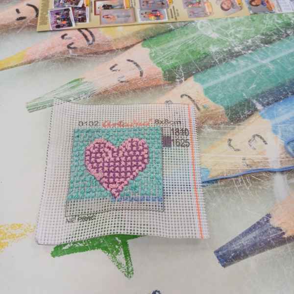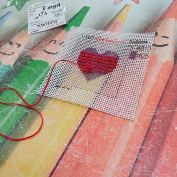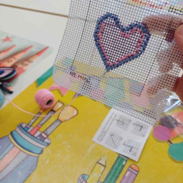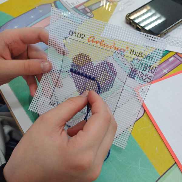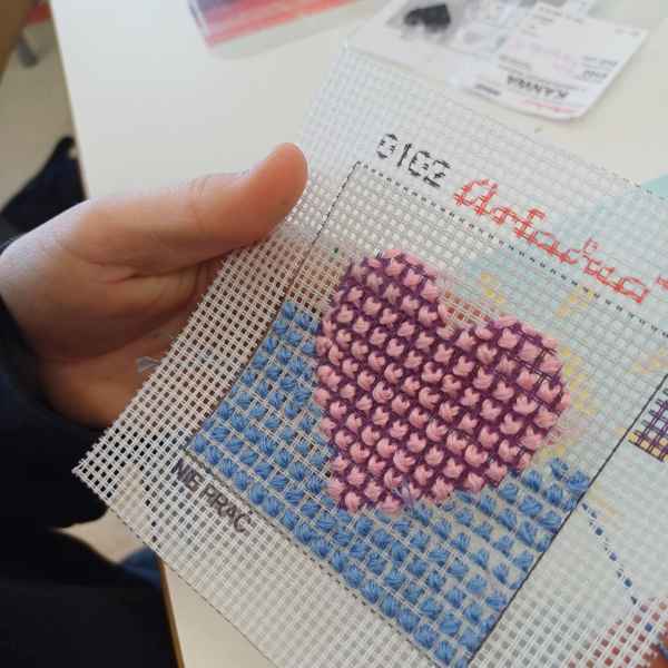 Podczas spotkań uczniowie pracowali z igłą, kolorową muliną i specjalnym materiałem, na którym powstawały piękne haftowane serduszka. Choć zadanie początkowo wydawało się trudne, młodzież z entuzjazmem podjęła wyzwanie, a efekty ich pracy przeszły najśmielsze oczekiwania. Co najważniejsze – nie tylko dziewczynki zachwyciły się haftem, ale również chłopcy z zaangażowaniem tworzyli swoje kolorowe wzory.