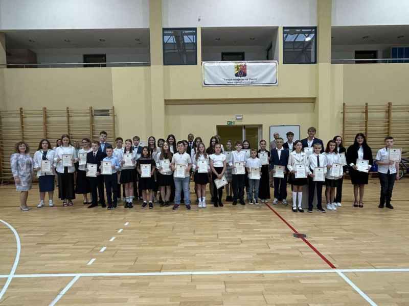 Najpierw wszyscy uczniowie odśpiewali hymn Polski, następnie Pani dyrektor, Bożena Brzuzy,wygłosiła mowę do uczniów oraz podziękowała nauczycielom i pracownikom za pracę w bieżącym roku szkolnym. Najlepszym uczniom zostały wręczone stypendia naukowe i sportowe, a uczniom - prymusom klas świadectwa z wyróżnieniem. Na zakończenie Przewodniczący Rady Gminy wręczył najbardziej aktywnym uczniom nagrody za akcję „ROWEROWY MAJ”,a dla jednego z nich wylosowany został rower. Na koniec Przewodnicząca Rady Rodziców, Pani Barbara Przygoda, podziękowała dyrekcji szkoły, nauczycielom oraz pracownikom administracji i obsługi za owocną współpracę, a także wręczyła upominki dla trzech najlepszych uczniów szkoły, a byli to Leon Stolc, Paulina Gulcz i Zuzanna Ustarbowska. Wszystkim stypendystom i nagrodzonym serdecznie gratulujemy i dziękujemy za postawę godną ucznia naszej szkoły. Życzymy udanych wakacji i spotkania się w kolejnym roku szkolnym 2025/2026.