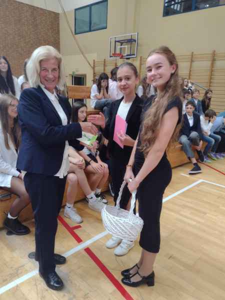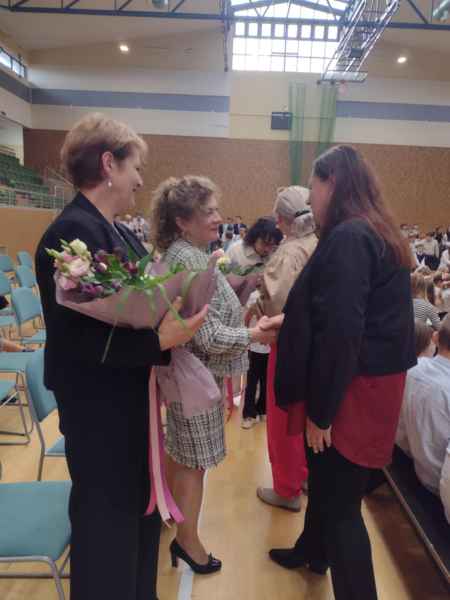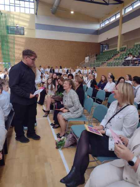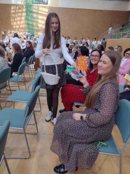 Nie zabrakło też życzeń, które w imieniu społeczności uczniowskiej złożył Samorząd Uczniowski, a w imieniu Rady Rodziców jej przewodnicząca p. Barbara Przygoda. Swoją wdzięczność wszystkim pracownikom szkoły za ich pracę wyraziła również p. Bożena Brzuzy, dyrektor naszej szkoły. Każdy pracownik szkoły został obdarowany upominkiem przygotowanym przez uczniów. Dziękujemy wszystkim zaangażowanym w przygotowanie uroczystości, a pracownikom naszej szkoły jeszcze raz dziękujemy za ich wkład włożony w naszą edukację i wychowanie.