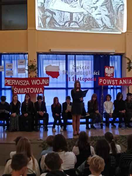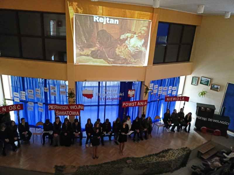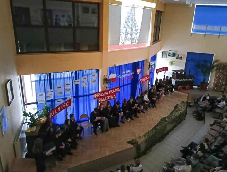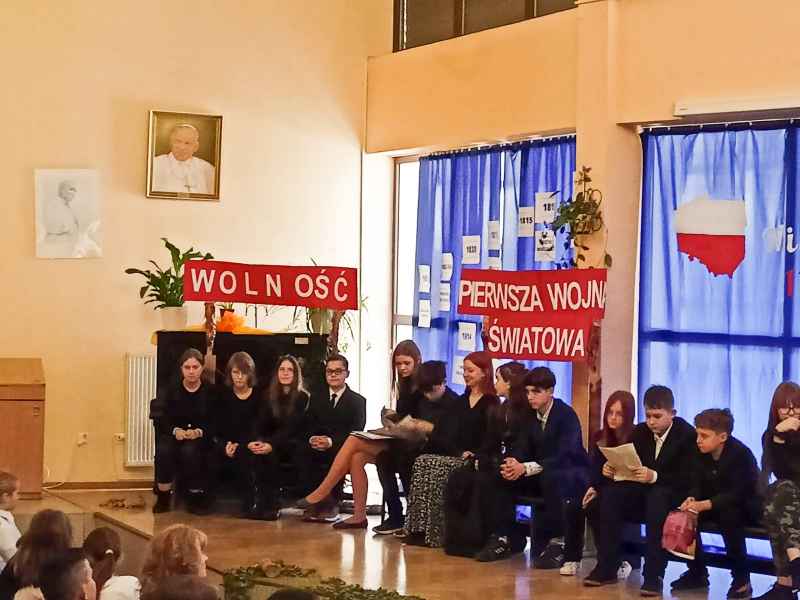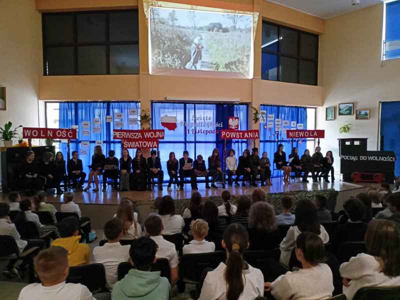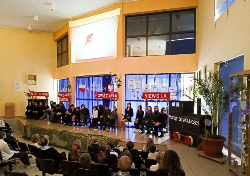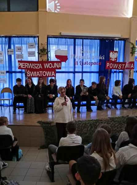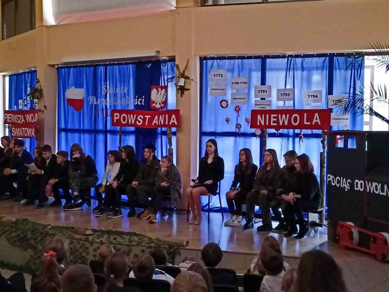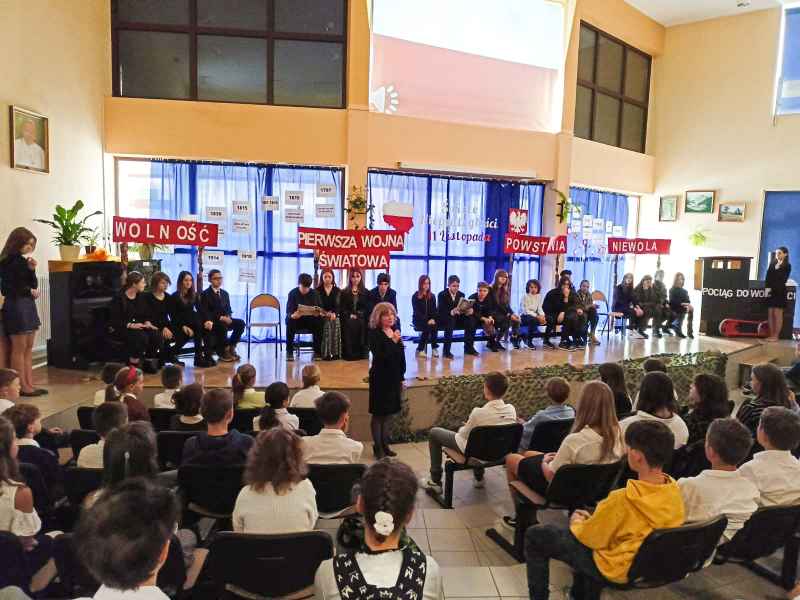 10 listopada starsze klasy świętowały 104 rocznicę odzyskania przez Polskę niepodległości. Uczniowie lasy 7a i 7e, pod opieką Pani Justyny Gąsiewicz, zaprosili nas na piękną lekcję historii. Wyruszyliśmy "Pociągiem do niepodległości" w wyjątkową podróż.