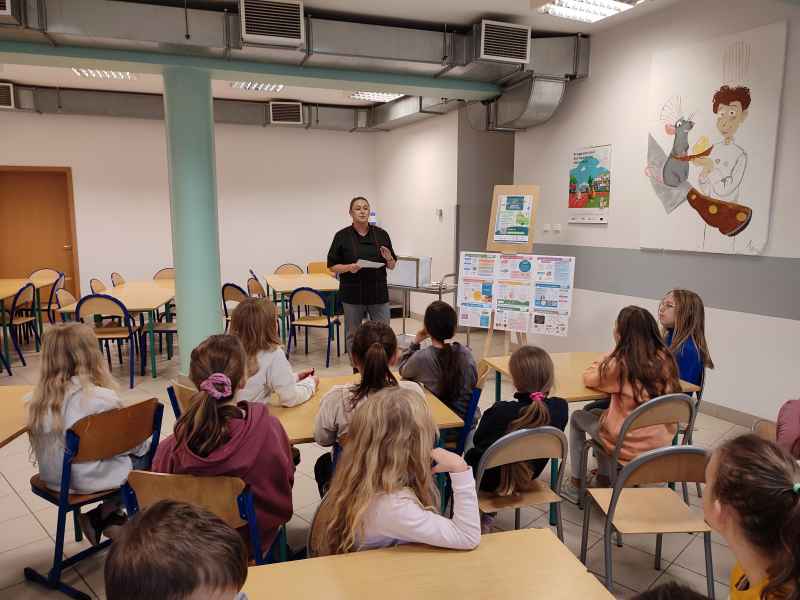 Klasy trzecie, które realizują projekt edukacyjny „Zdrowo i sportowo”, wzięły udział w zajęciach na temat zdrowego odżywania. W scenerii szkolnej stołówki, która sprzyja rozmowom o jedzeniu, uczniowie spotkali się z Panią intendentką Anną Hoppa. Zajęcia były bardzo ciekawe, gdyż obejmowały nie tylko część teoretyczną z omówieniem piramidy żywienia i zawartości zdrowego talerza, ale również praktyczną.