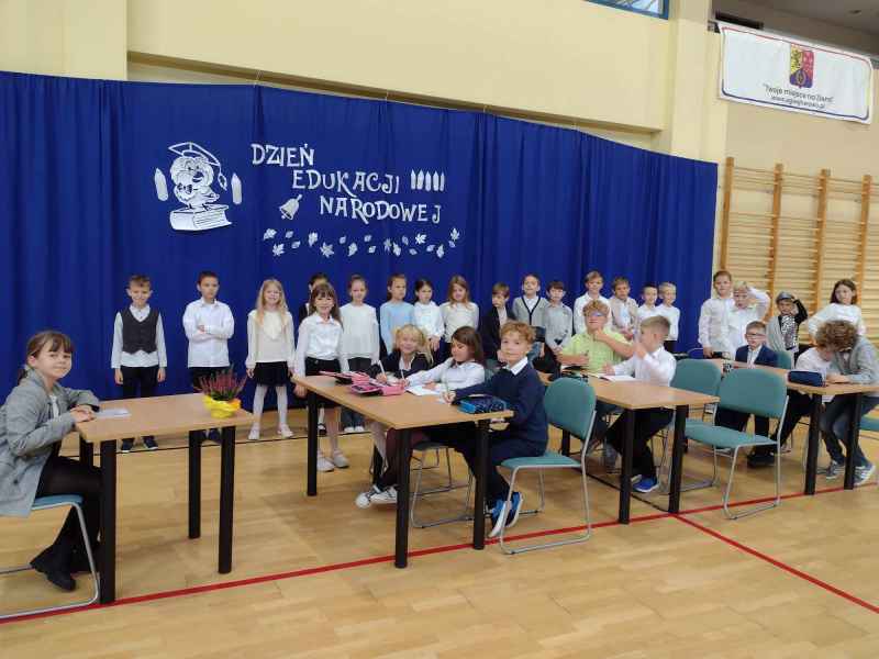 W piątek 13 października w naszej szkole nauczyciele, pracownicy i uczniowie świętowali Dzień Edukacji Narodowej. W tym roku był to szczególny dzień – 250. rocznica powołania Komisji Edukacji Narodowej (1773 r.) Tradycyjnie whali sportowej zgromadzili się wszyscy uczniowie i pracownicy szkoły. Przewodniczący Samorządu Uczniowskiego, Leon Stolc, przywitał zgromadzonych, a następnie głos zabrała pani dyrektor Bożena Brzuzy,