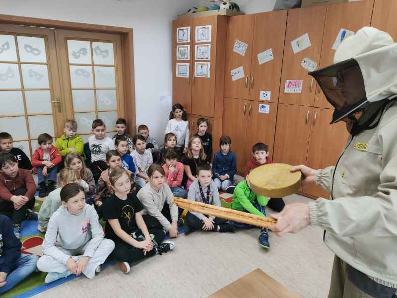 W ramach projektu edukacyjnego „Pożyteczne pszczoły” uczniowie klasy 2 A i 2 B wzięli udział w ciekawym spotkaniu z pszczelarzem. Pan Zygmunt Hazuka przedstawił wiele ciekawostek na temat pasieki, uli, rodzin pszczelich i roli tych pracowitych owadów.