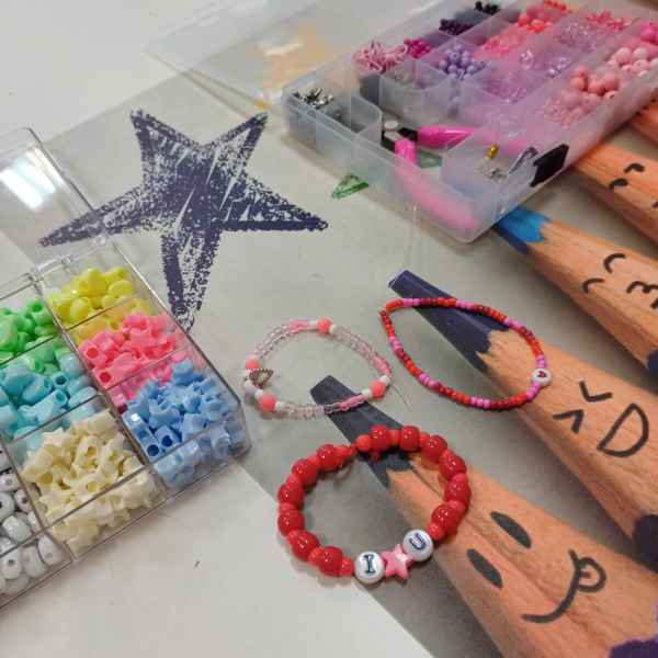 Samodzielne wykonywanie bransoletek z kolorowych koralikówi sznurków okazuje się być nie lada wyzwaniem dla uczniów klasy 5c podczas zajęć rozwijających pod opieką nauczyciela Bożeny Reszke .