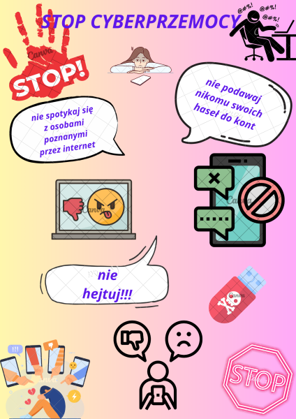 Zgodnie z kierunkiem polityki oświatowej państwa na rok 2024/2025 szkoła podjęła działania, w ramach projektu edukacyjnego „Jestem Bezpieczny w sieci”. Uczennice klasy 7e wzięły udział w akcji STOP CYBERPRZEMOCY. Przeprowadziły pogadanki w klasach młodszych, przestrzegając ich o zagrożeniach, jakie czyhają na nich w Internecie.