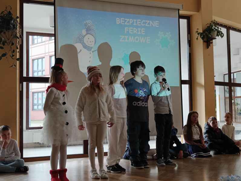 Przed samymi feriami uczniowie klasy 3B zaprosili wszystkie dzieci klas młodszych oraz oddziałów przedszkolnych do obejrzenia apelu "Bezpieczne ferie zimowe". Podczas przedstawienia mali aktorzy przypomnieli najważniejsze zasady, o których należy pamiętać, aby nasze zabawy zimowe były zawsze bezpieczne.