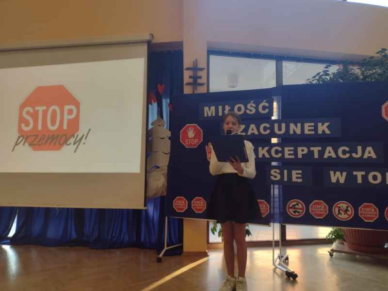 Uczniowie klasy VII d i VIII d pod kierunkiem nauczycieli współorganizujących kształcenie integracyjne, pani Bożeny Reszke i Olgi Szewczyk, odegrali sytuacje, które niestety mogą pojawiać się w naszym otoczeniu. Przypomniały również, że w każdej sytuacji, gdy jesteśmy ofiarą czy też świadkiem przemocy, powinniśmy reagować i prosić o pomoc dorosłych.