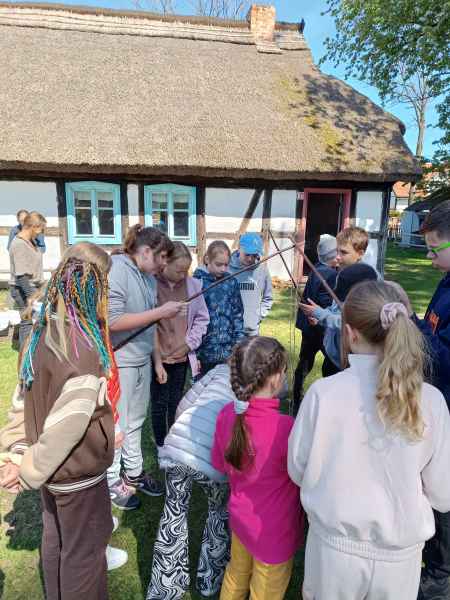 W ramach projektu grantowego, dnia 09 maja 2024 r., udaliśmy się na wycieczkę do skansenu w Klukach. Celem projektu jest integracja uczniów z różnych środowisk migracyjnych. W wycieczce wzięli udział uczniowie pochodzenia ukraińskiego, jak i kaszubskiego czy napływowego z innych części Polski. Gdy dojechaliśmy na miejsce dzieci zostały podzielone na dwie grupy: pierwsza wzięła udział w zajęciach pt.: „Wokół kuchennego pieca”.