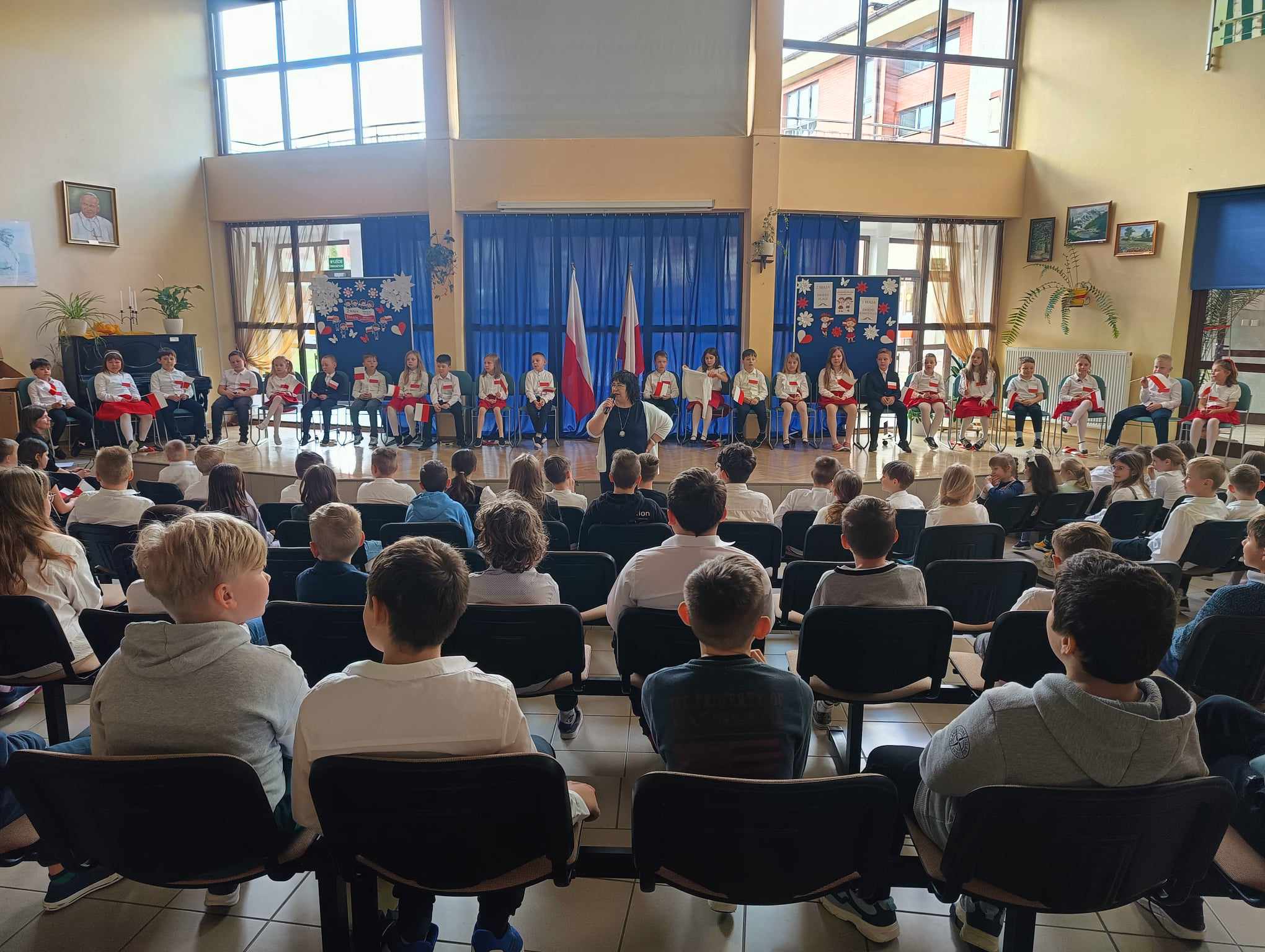 26 kwietnia w ostatni piątek przed długim weekendem uczniowie klasy 2a zaprosili społeczność szkolną klas młodszych na uroczysty apel z okazji Dnia Flagi oraz uchwalenia Konstytucji 3 Maja. W tym podniosłym dniu wszyscy uczniowie przybyli do szkoły ubrani na galowo, aby swoim strojem podkreślić podniosłość wydarzeń. Akademia rozpoczęła się wspólnym odśpiewaniem hymnu Polski. Następnie w części artystycznej uczniowie klasy 2a zaprezentowali swoje umiejętności.