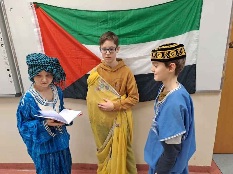 22.02 klasy piąte poznały pochodzenie Arabów. Dzieci dowiedziały się kim był i co zrobił Mahomet oraz jak narodził się islam. Igor S.,Hubert N. i Piotr K. z 5g odegrali scenkę nawiązującą do wydarzeń z Mekki z VIIw. Allach przekazał prorokowi 5 filarów islamu, które potem zapisano w Koranie.