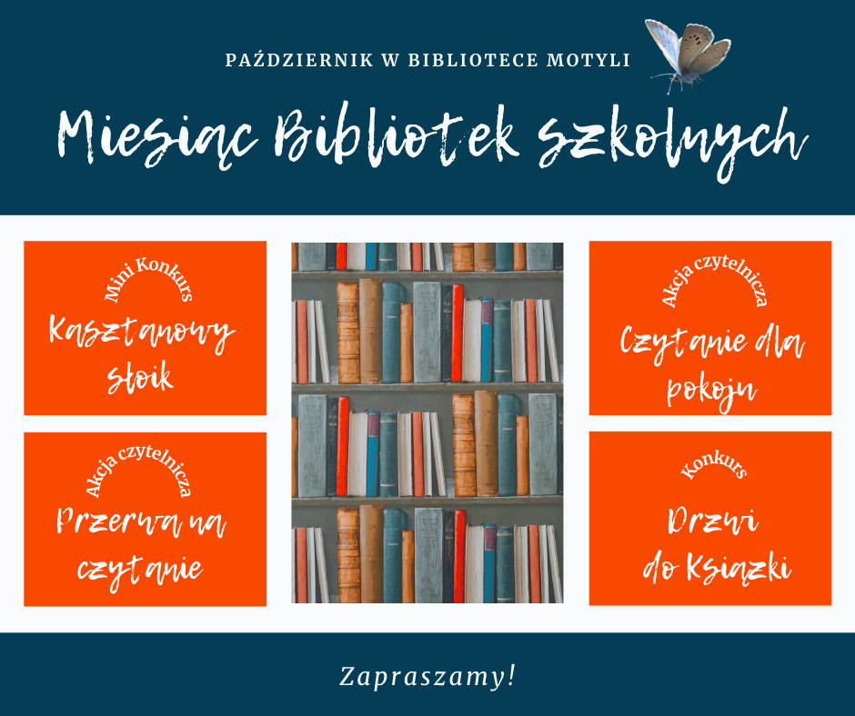 Październik to szczególny miesiąc dla wszystkich bibliotek szkolnych. Nie inaczej będzie w Bibliotece Motyli, gdzie ten jesienny miesiąc upłynie także pod znakiem obchodów Międzynarodowego Miesiąca Bibliotek Szkolnych. A będzie się działo!